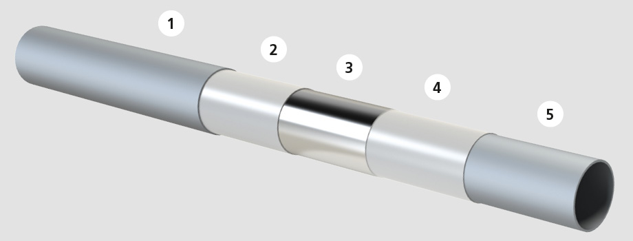 1. Aussenschicht aus PE-RT Typ I 2. Haftvermittler 3. Aluminium-Rohr, längs-stumpfgeschweisst 4. Haftvermittler 5. Innenrohr aus PE-RT Typ I