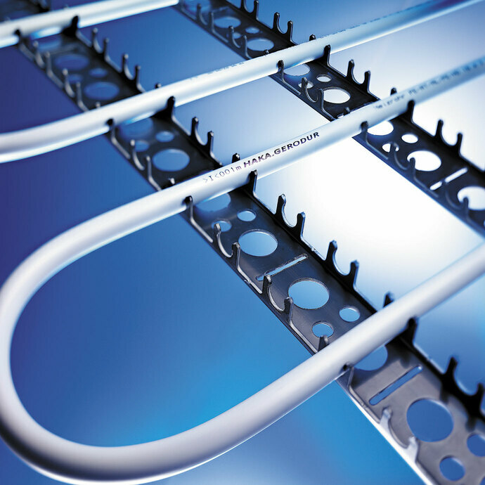 An innovative fastening method for underfloor heating pipes: The U-shaped laying rails meet all requirements for efficient pipe laying. The pipes are simply and quickly clicked into the mounting rail, so that corrections can be easily made during installation.