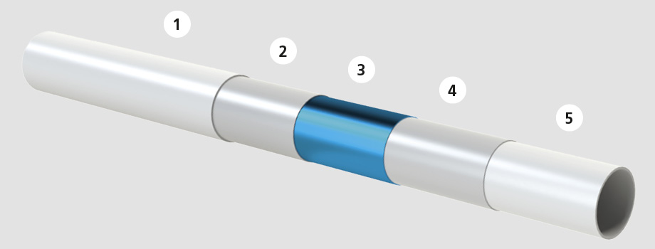 1. ‎Inner layer of PE-RT type II 2. Adhesion promoter for a force-fit connection 3. EVOH-Oxygen barrier layer 4. Adhesion promoter for a force-fit connection 5. Outer layer of PE-RT type II